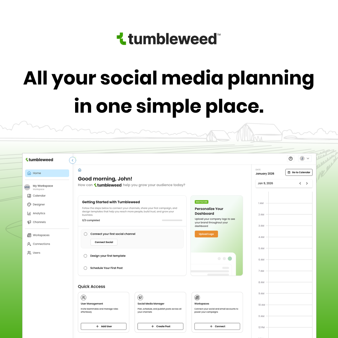 CHILLICOTHE, MO, UNITED STATES, April 23, 2026 /EINPresswire.com/ — Bailey AG, today announces the release of its new Producer Plan inside Tumbleweed™, the company’s easy-to-use social media marketing tool built for rural businesses. The plan is designed for agricultural producers and small retailers who need a clean, practical way to manage their online presence without slowing down day‑to‑day operations.